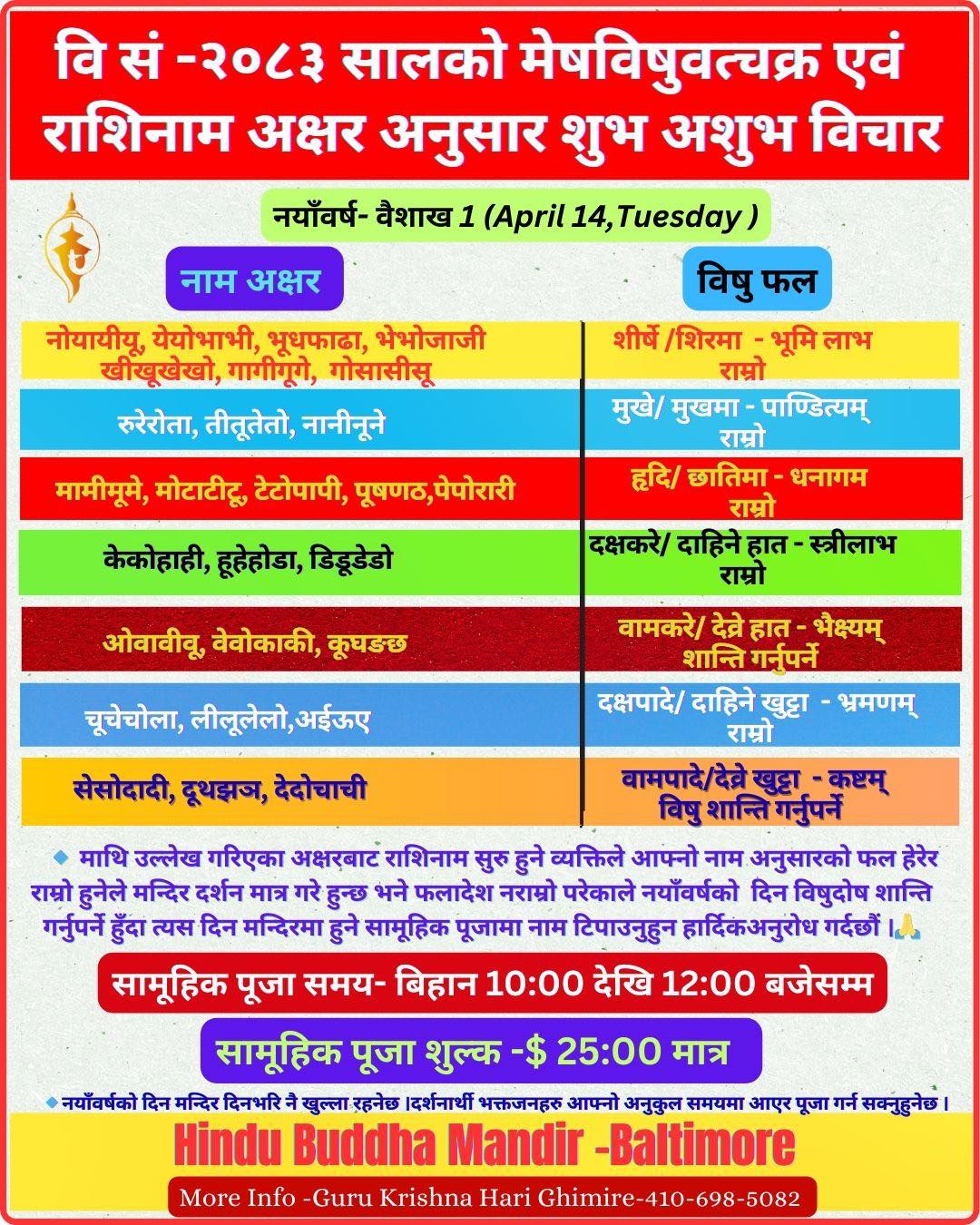 आउँदै गरेको नयाँवर्ष २०८३ नामराशि अनुसार आफ्नो लागि केकस्तो रहेको छ यसबाट हेर्नुहोला है। र विषुशान्ति गर्नुपर्ने भएमा वैशाख संक्रान्तिको दिन मन्दिरमा हामीले गतवर्ष जस्तै यसवर्ष पनि सामूहिकविषुशान्तिकार्यक्रम गरिने हुँदा अग्रिम सम्पर्क गरी नाम टिपाउनुहुन सबैलाई सूचित गर्दछौं ।
