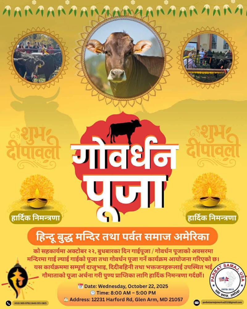 गाइको पूजा, लक्ष्मी माता एवं धनकि देवी को साक्षात पूजा, गौपूजन, नेपालीको धार्मिक सांस्कृतिक र परंरागत मान्यता अनुसार बिगतका वर्षहरूमा झैं यस सालमा पनि अक्टोबर २२ ( बिहान ८ देखि सांझ ५ बजे सम्म ) हिन्दु बुद्ध मन्दिरमा दुईवटा गाइ ल्याउदौं छौं। पर्वत समाज अमेरिका को संयोजन र सहयोग मा हुने गाइ पूजा कार्यक्रममा सपरिवार आइ गाइ पूजामा सहभागी भै दिनुहुन सबैलाई निमन्त्रणा छ।